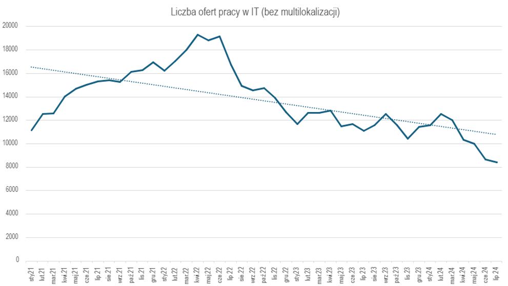 Poniższy wykres przedstawia liczbę ofert pracy #IT z 4ech największych job boardów w Polsce w latach od 01.2021 do 07.2024