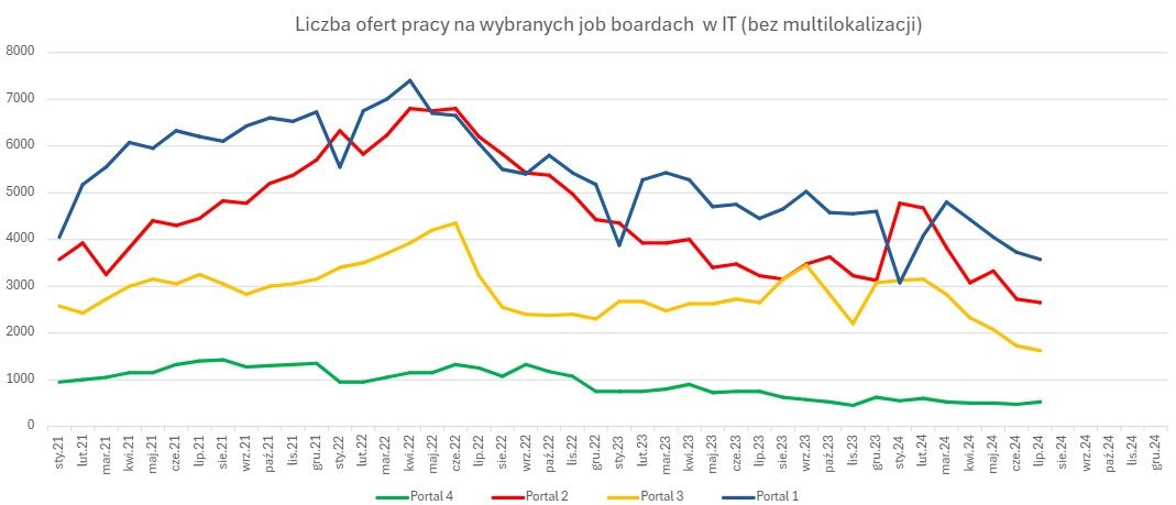 - Na Portalu nr 2 opublikowano odpowiednio w 2021 – 53,6 K ofert pracy, w 2022 – 71 K, w 2023 już 43 K, zaś za H1.2024 – 22,4 K