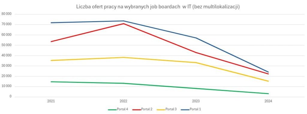 - 2023 vs 2022 – wszystkie job boardy zanotowały spadek, Portal 2 o 40%, Portal 4 o 38%, Portal 1 o 22% i Portal nr 3 o 13%.