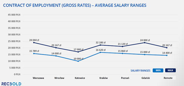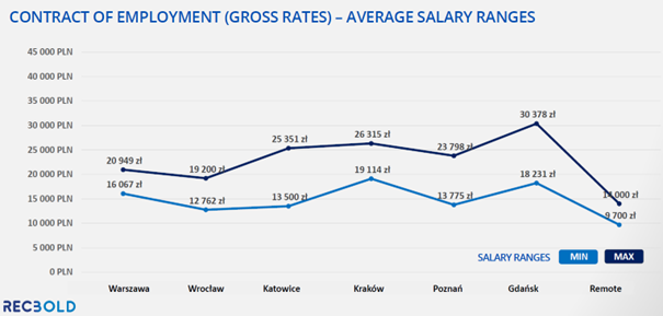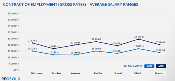Średnie wynagrodzenie oferowane w ofertach pracy dla ABAP Developerów na umowę o pracę było najwyższe dla miast: Gdańsk, Kraków, Warszawa (nawet do 24 700 PLN brutto dla górnych widełek i powyżej 17 000 PLN brutto dla widełek dolnych).