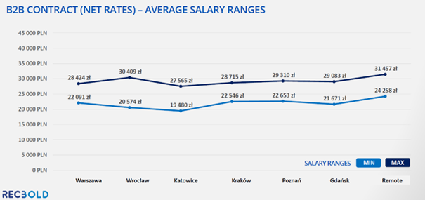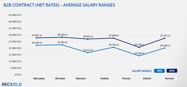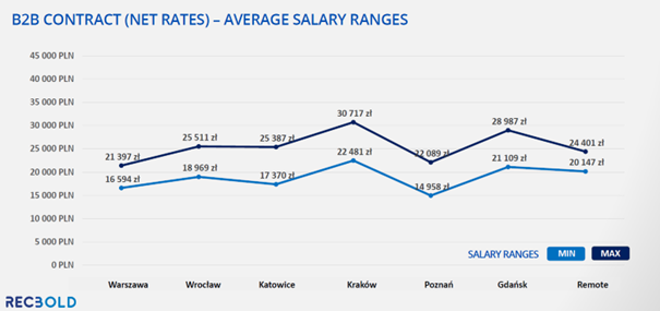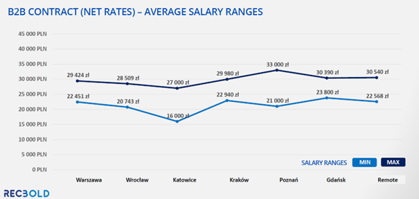 Średnie wynagrodzenie oferowane w ofertach pracy na umowę B2B dla ABAP Developerów na umowę B2B było najwyższe dla miast: Wrocław, Warszawa, Kraków (powyżej 28 000 PLN netto dla górnych widełek i powyżej 22.500 PLN netto dla widełek dolnych).