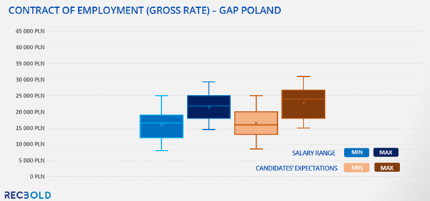 W przypadku umowy o pracę, dla przedziału minimalnego różnica wynosiła 447 zł, czyli 3% były wyższe oczekiwania kandydatów, natomiast dla przedziału maksymalnego różnica ta wynosiła 1 396 zł, czyli 6%.