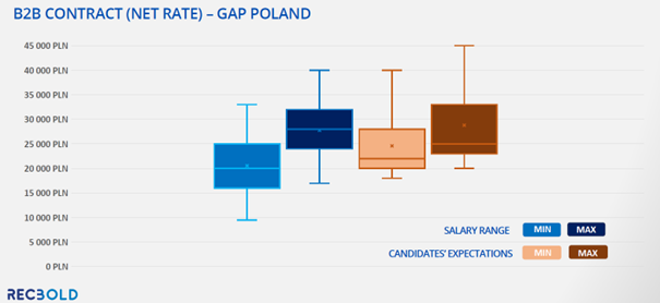 Przy umowie B2B, dla przedziału minimalnego, różnica wynosiła aż 4 034 PLN, czyli 16% wyższe były oczekiwania kandydatów względem ofert pracy, podczas gdy dla przedziału maksymalnego różnica ta wyniosła 1 019 PLN, czyli tylko 4%.